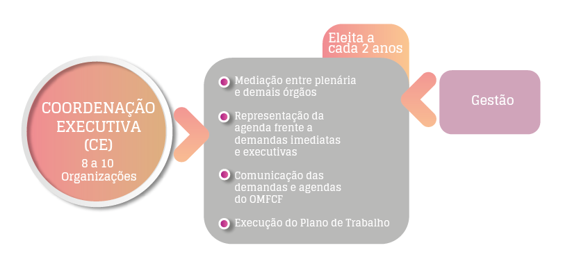 Instância estratégica para a gestão do OMFCF. Deve ser formada por um grupo menor de organizações, de forma a facilitar seu funcionamento. Responsável pela agenda de trabalho do OMFCF, faz a mediação entre a plenária e os demais órgãos, assim como anima e executa as ações, sempre em diálogo e articulação com as organizações associadas.
